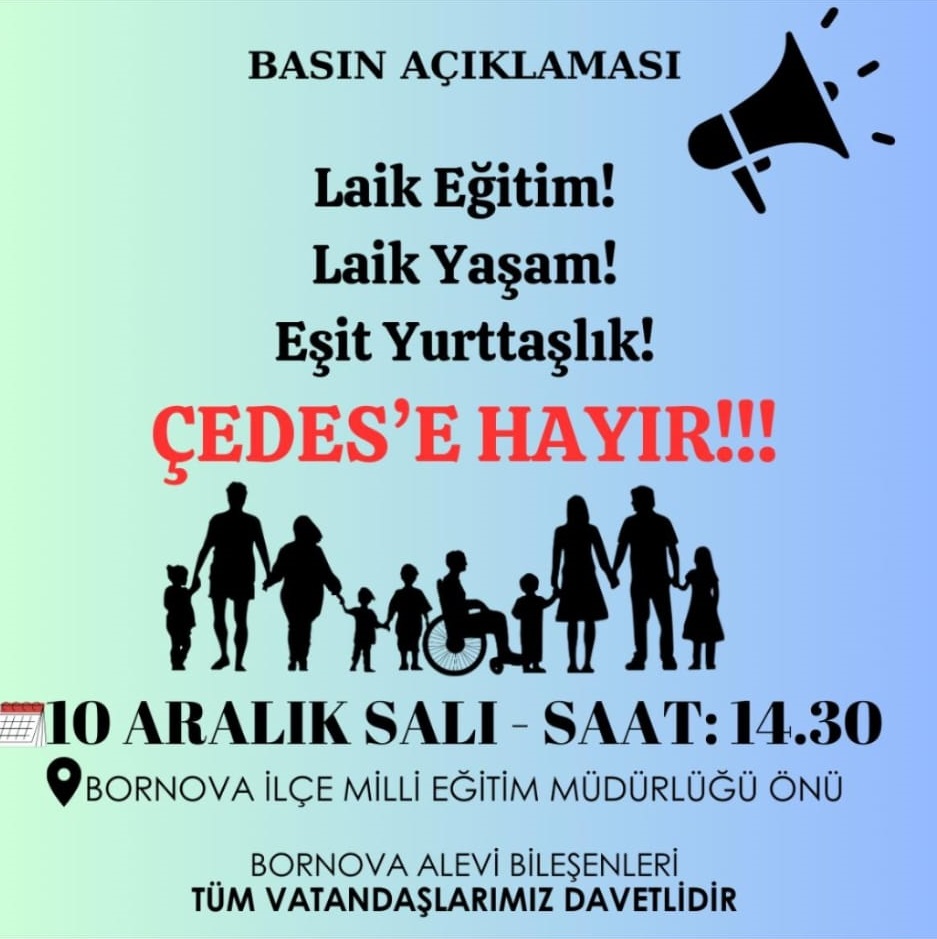 Bornova Cemevi Güncel Haberler Aralık 7, 2024Aralık 7, 2024 Bornova Alevi Bileşenleri Çedes’i Protesto Ediyor Gönderen: admin Bornova Alevi Bileşenleri Çedes’i Protesto Ediyor. Laik eğitim, Laik yaşam, Eşit yurttaşlık şiarıyla 10 Aralıkta Bornova Milli Eğitim Binasının önünde protesto gerçekleşecek. Okunma Sayısı: 477 Beni Paylaşırsan Sevinirim :)